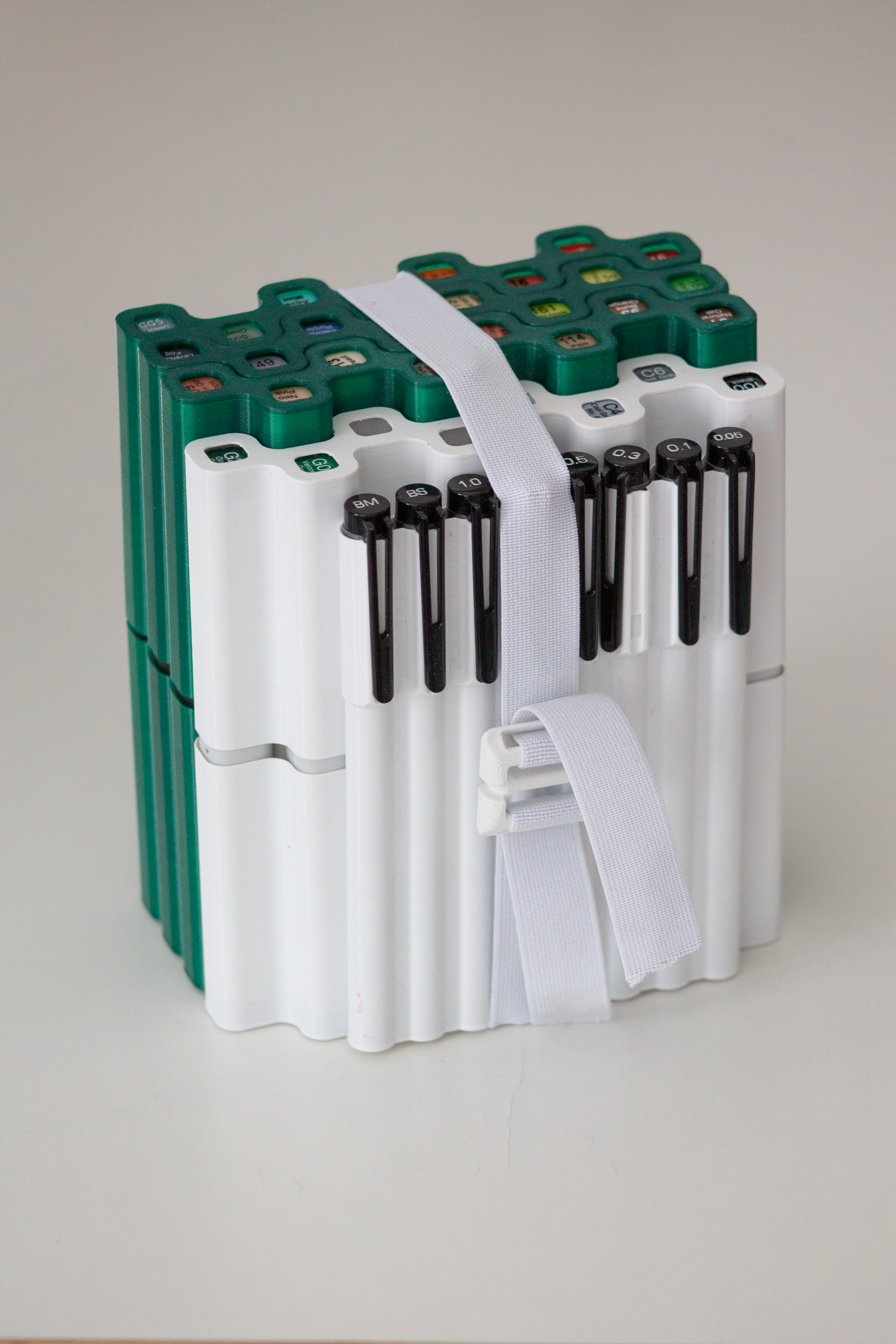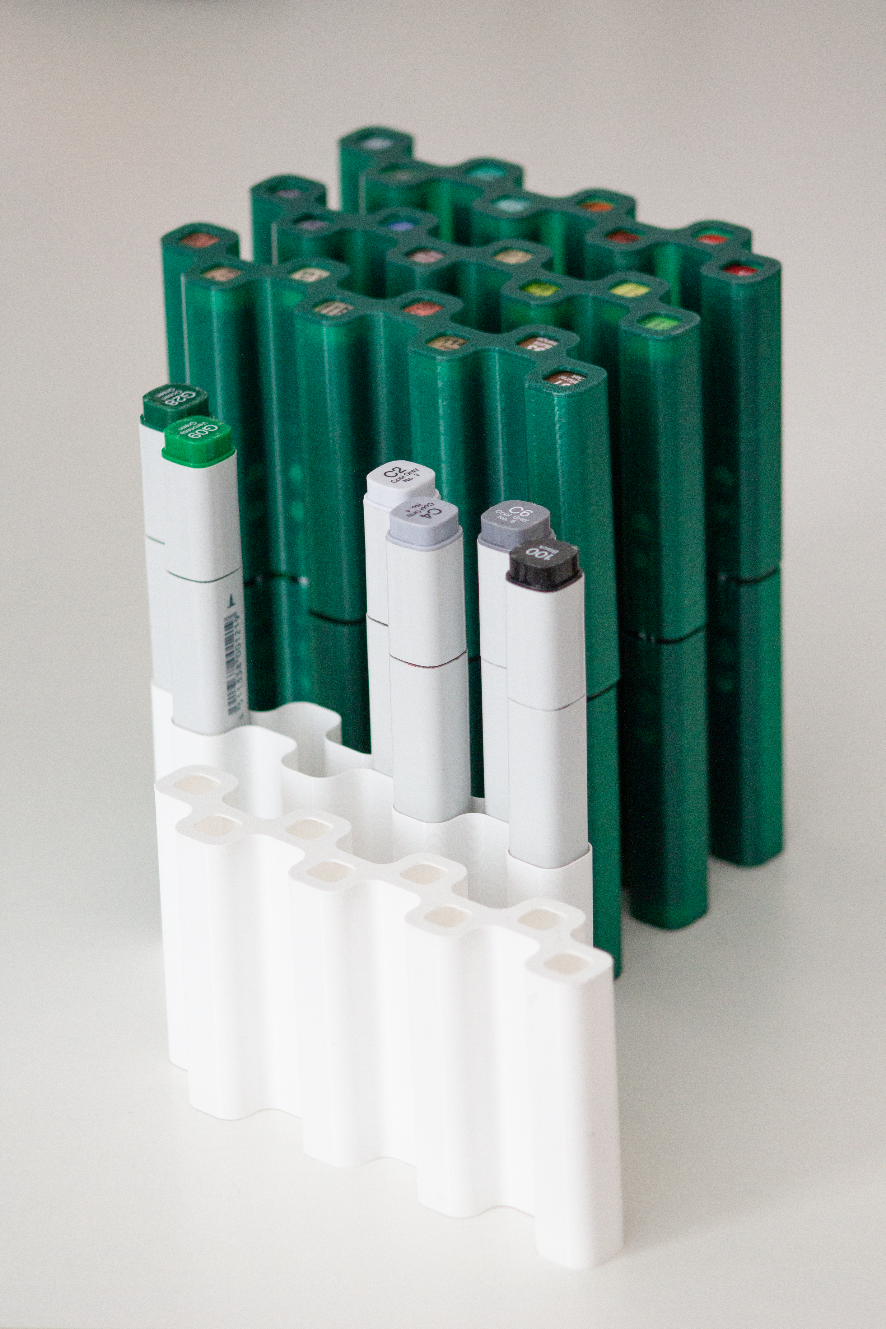 In order to organize, store and transport my various alcohol markers more easily, I designed and printed dedicated pen containers.